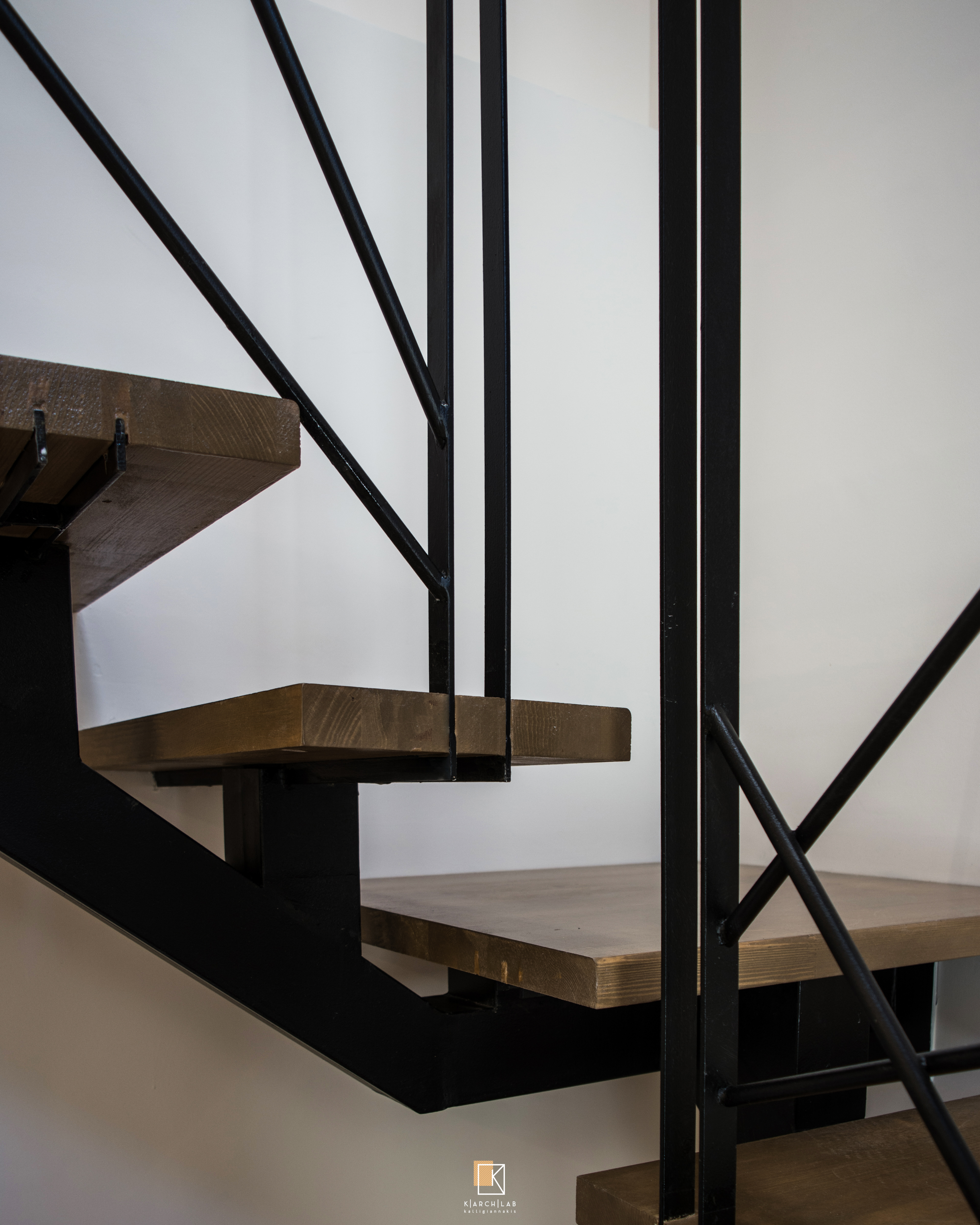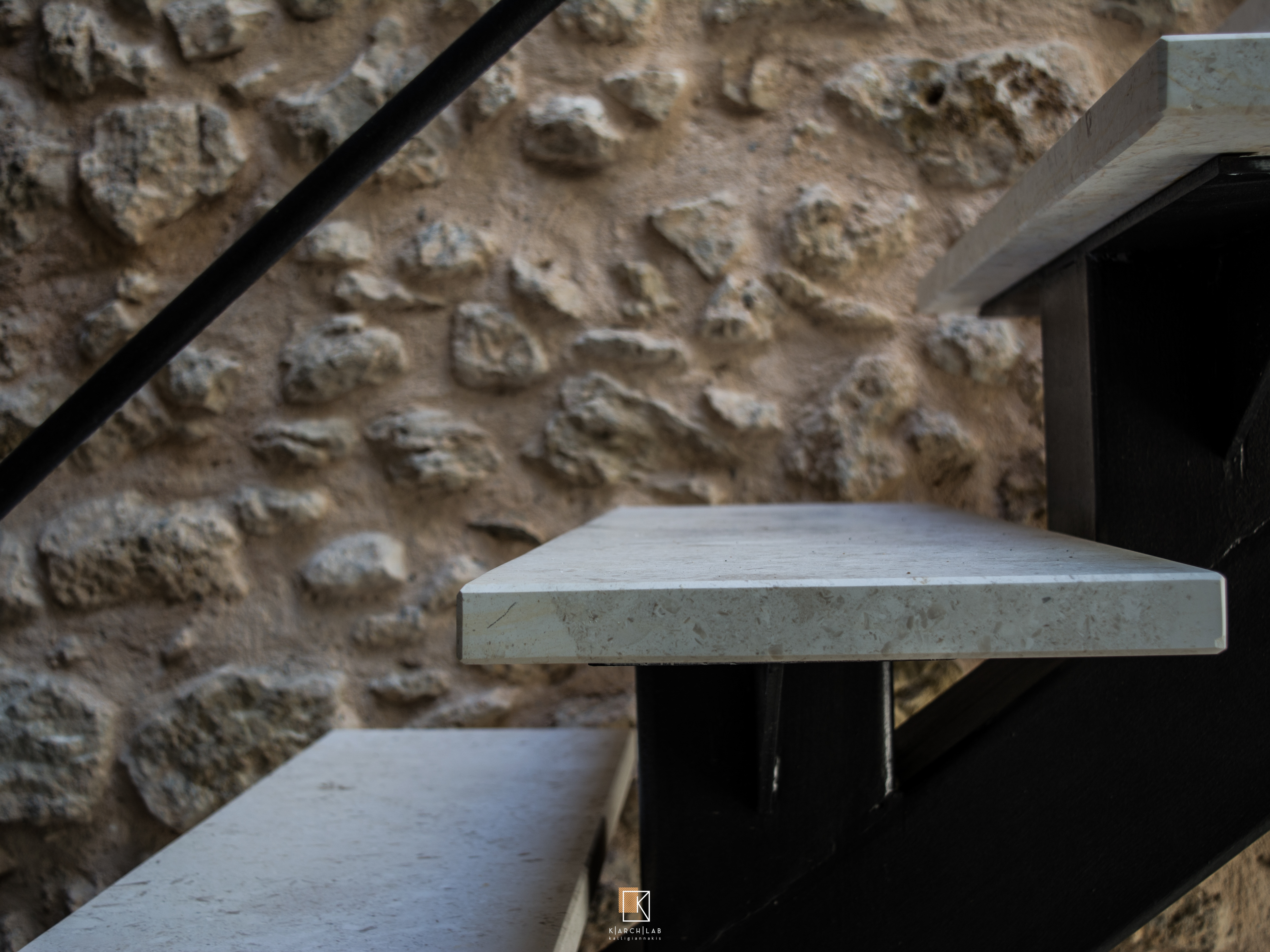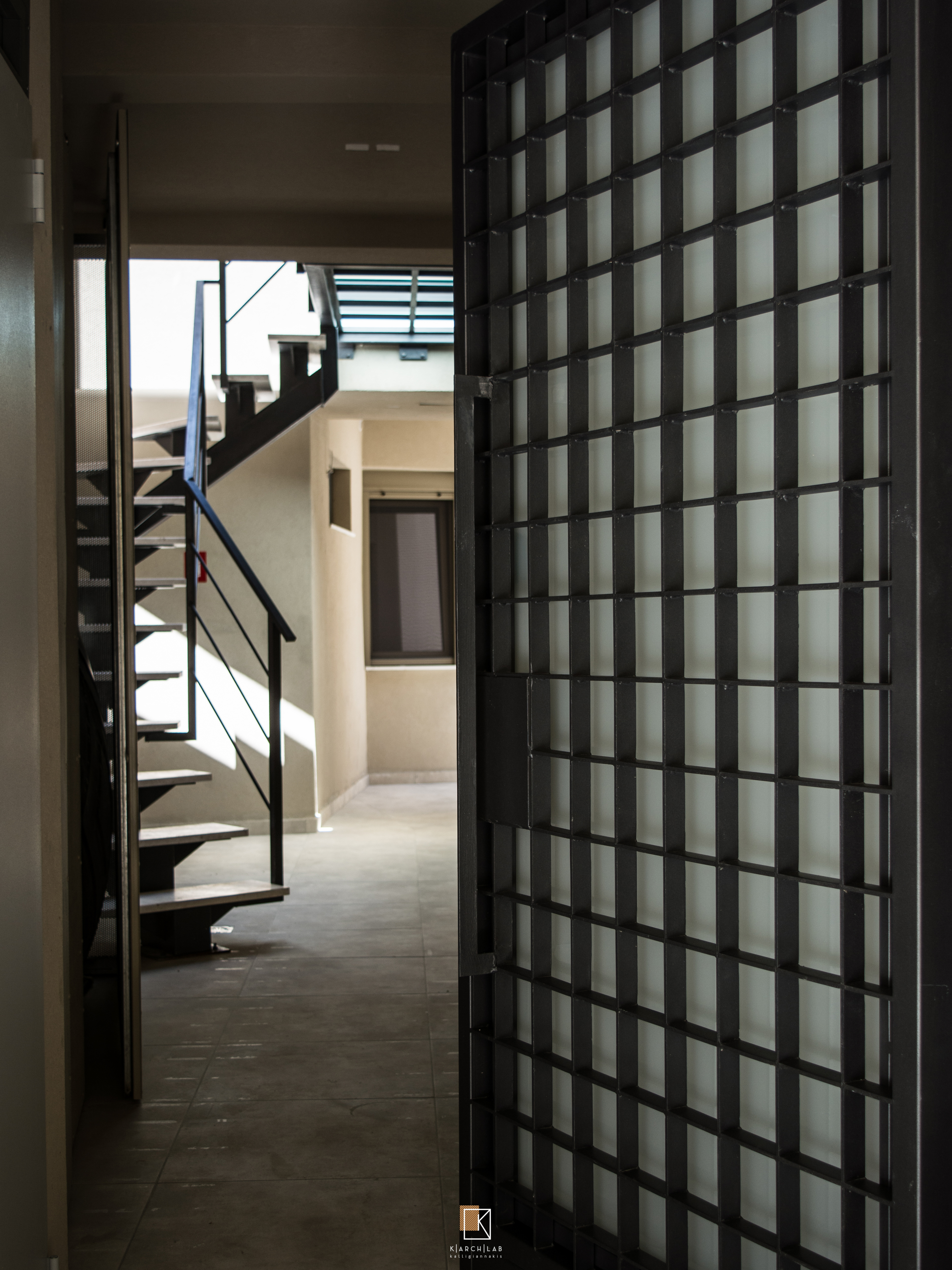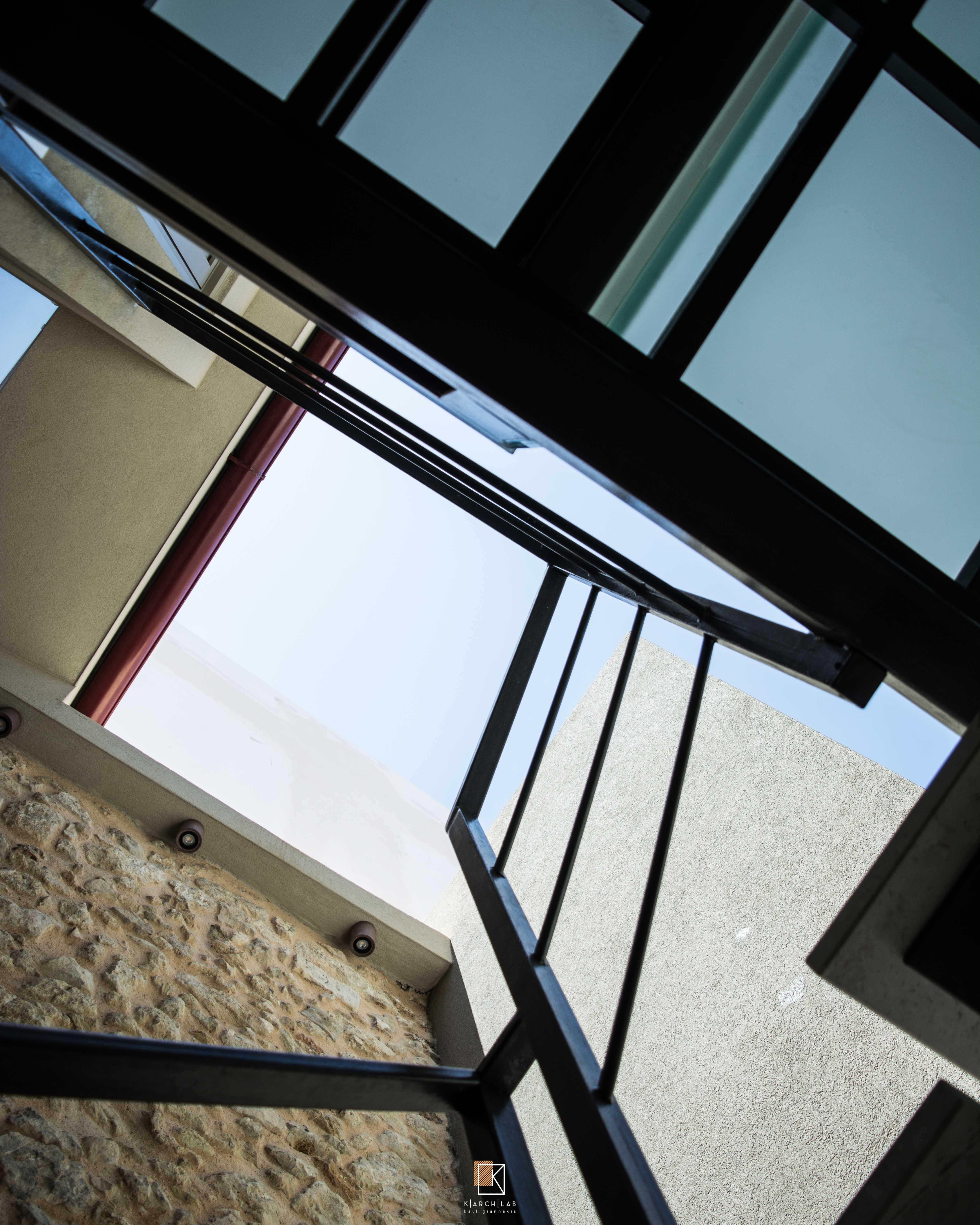 Οι εξωτερικοί χώροι στρώθηκαν με πλάκες που θυμίζουν πατητή τσιμεντοκονία, ενώ η κοινόχρηστη σκάλα που οδηγεί στον α’ όροφο αποτελείται από μεταλλικό σκελετό και πατήματα από μάρμαρο σε μια προσπάθεια αρμονικής συνύπαρξης με τον πέτρινο τοίχο. Η βαριά, σιδερένια πόρτα, σηματοδοτεί την είσοδο στο συγκρότημα, από την οδό Σκρα.