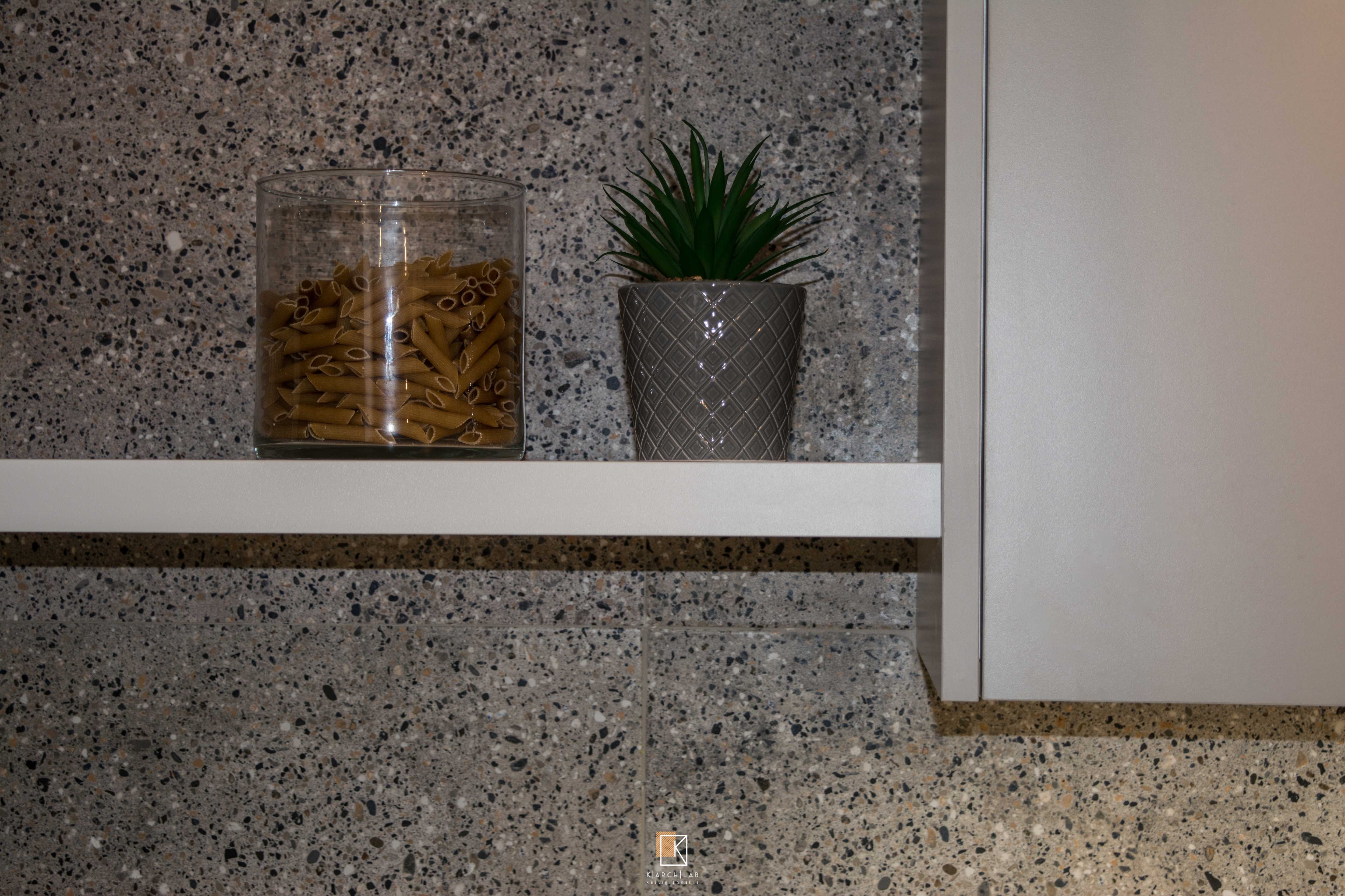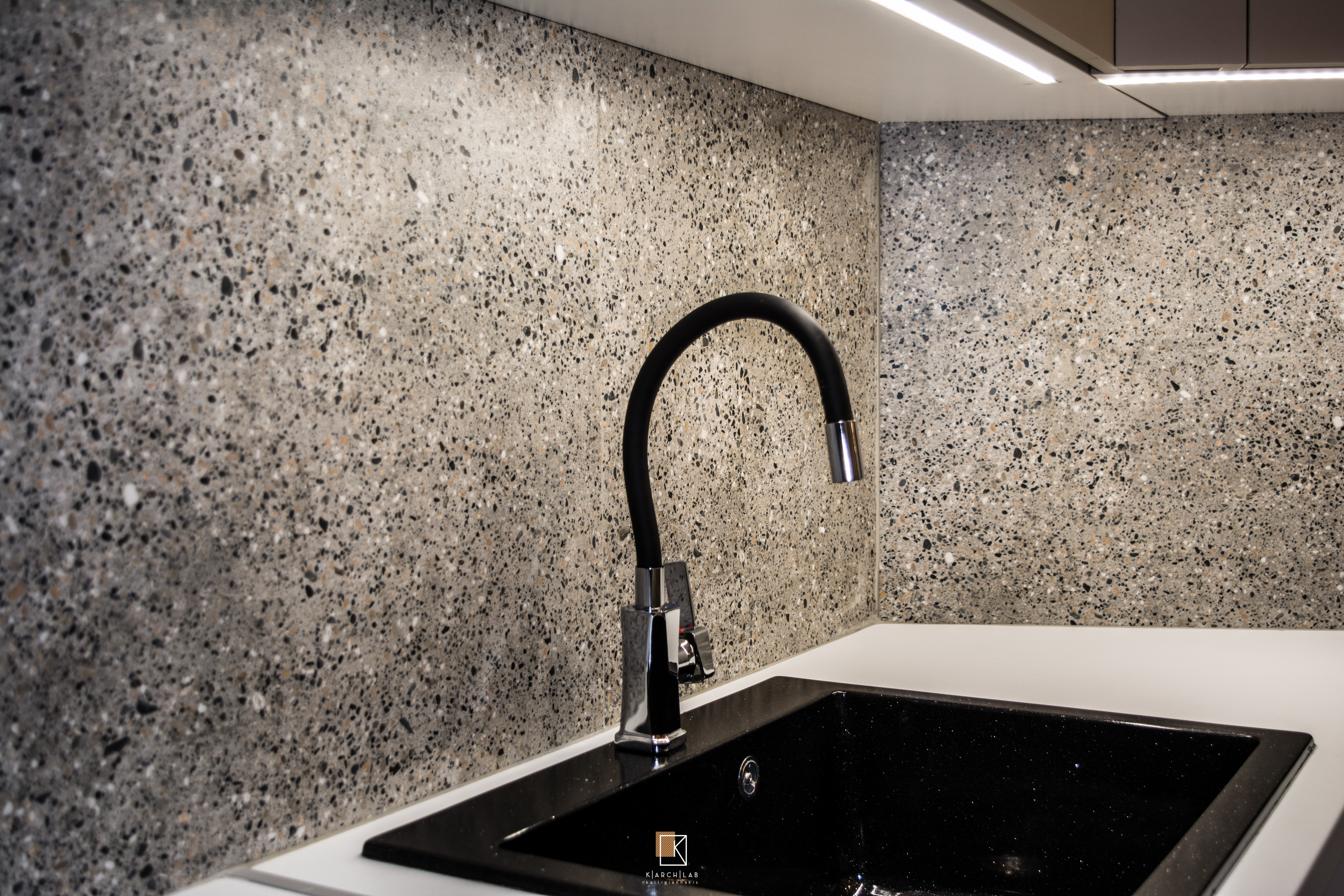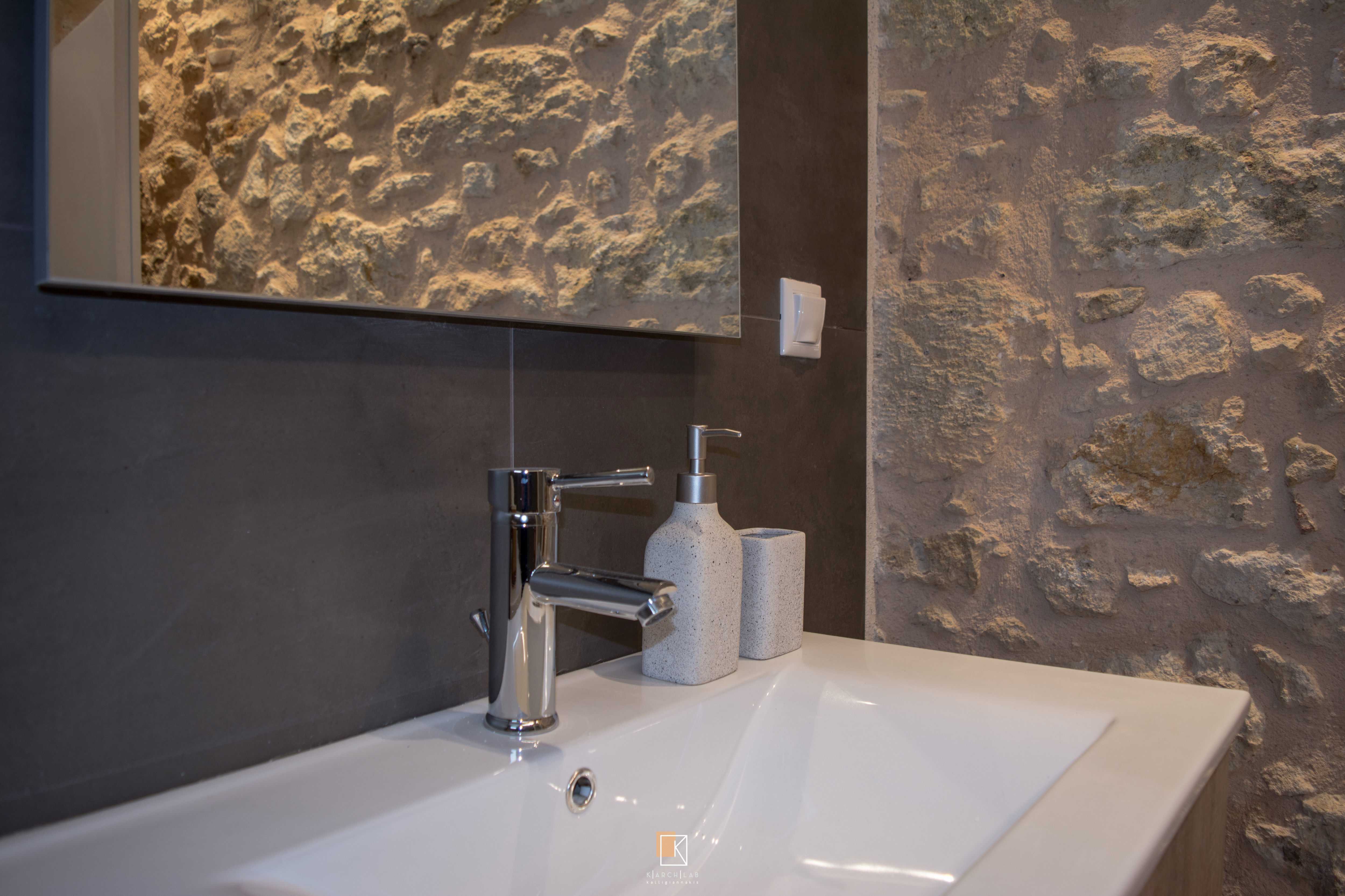Η τοποθεσία του συγκροτήματος αλλά και τα πέτρινα στοιχεία (τοιχοποιίες) που αναδύθηκαν κατά το στάδιο της ανακαίνισης, έπαιξαν καθοριστικό ρόλο στη διαμόρφωση της παλέτας υλικών. Οι πέτρινοι τοίχοι συντηρήθηκαν και πλέον είναι εμφανείς, δίνοντας μια ιδιαίτερη ταυτότητα. Οι λευκές επιφάνειες κυριαρχούν, τόσο στις τοιχοποιίες όσο και στις ξύλινες (ντουλάπες-κουζίνες-έπιπλα). Για τα λουτρά και τις ‘πλάτες’ στις κουζίνες επιλέχθηκε το terrazzo και η υφή του πετρώματος, ενώ η εσωτερική σκάλα της κατοικίας του ορόφου σχεδιάστηκε με συνδυασμό ξύλου και μετάλλου.