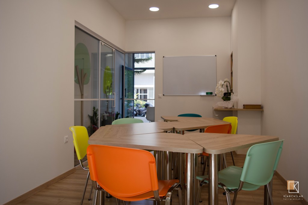 Οι λευκές επιφάνειες δημιουργούν ένα παιχνίδι με τα χρωματιστά στοιχεία, ως βασικό στοιχείο ενός χώρου που σχεδιάστηκε για παιδιά.